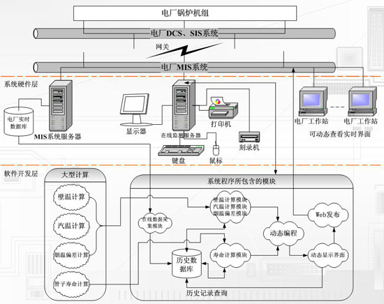 本產(chǎn)品利用原有的爐外溫度測點(diǎn)(大罩殼中),無需增加測點(diǎn)(因為本產(chǎn)品可以顯示所有管子爐內(nèi)各點(diǎn)的壁溫和汽溫,所以原來要進(jìn)DCS的測點(diǎn)現(xiàn)在可以在我們產(chǎn)品中顯示,節(jié)約了DCS的投入成本),不參與控制。只要求提供一個網(wǎng)絡(luò)接口和一個服務(wù)器電源接口。